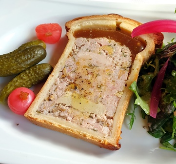 L’ Hermitage Jean-Louis Chave Blanc 2002 a une jolie couleur de miel clair gorgé de soleil. Le nez m’évoque du fumé alors que pour mon ami c’est le tabac qui est en avant-scène. Le vin est riche, ample, gras, et le fumé lui apporte une force de conviction. C’est un grand vin gastronomique, solide et indestructible. Avec le pâté en croûte l’accord est une évidence. Ce vin a une très belle longueur.