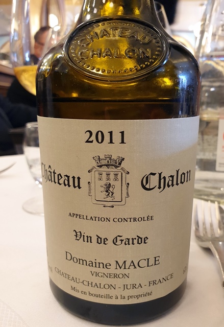 Mon ami arrive et je lui propose ce plan canaille. Il accepte. C’est le patron, Pierre, qui ouvre les bouteilles. Il ouvre un Château Chalon Domaine Macle 2011 et nous le fait goûter. Je trouve que le vin a une râpe un peu désagréable dans le finale mais je ne dis rien, tandis que mon ami qui connaît bien Pierre, lui dit que le vin est bouchonné. Faiblement, mais cela explique le désagrément que j’ai ressenti. Je n’aurais jamais renvoyé la bouteille car je suis fatigué de devoir argumenter dans ce genre de situations. La bouteille est remplacée et nous l’acceptons, même si l’on ressent aussi une légère imperfection dans cette bouteille. Il n’est pas question de récidiver. Le vin est un peu strict, rêche et je pense que s’il avait dix ans de plus ce défaut d’acidité et de rigueur disparaîtrait. De toute façon, je pressens que les cèpes vont gommer ces petits défauts et c’est le cas. Les cèpes sont délicieux et le Château Chalon est vraiment le partenaire idéal. Il le serait encore plus s’il avait cinquante ans de plus.