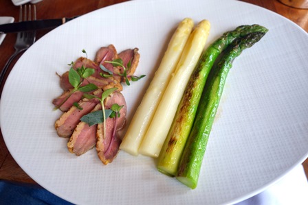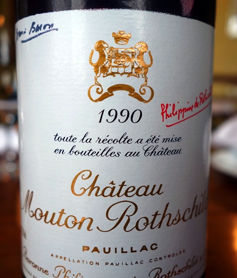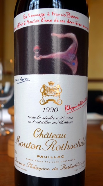 Je vais déjeuner au restaurant Le Petit Verdot. Hidé, toujours aussi accueillant, que j’avais rencontré à la présentation des vins de Bourgogne, m’avait incité à venir avec un vin. J’ai envie de vérifier dans quel sens évolue le Château Mouton-Rothschild 1990. Ce vin a été très critiqué car il ne représenterait pas ce que Mouton devrait donner pour cette année. Qu’en est-il aujourd’hui qu’il a vingt-cinq ans ? La bouteille a un niveau dans le goulot, le bouchon est de superbe qualité. Le nez est puissant, vineux, parfum d’un vin très jeune. Quel menu composer à partir de ce qui est proposé sur l’ardoise du restaurant ? Après discussion avec Hidé, nous décidons que l’entrée sera des asperges vertes et blanches accompagnées de magrets de canard froids en tranche, puis un bar juste cuit sur sa peau sans accompagnement, puis une pièce de bœuf dont la sauce au vin serait servie à part.