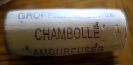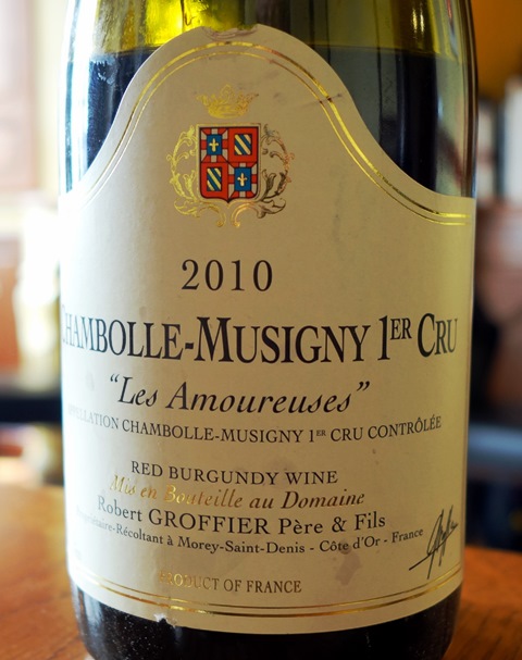 Le vin choisi est un Chambolle-Musigny 1er Cru Les Amoureuses domaine Robert Groffier P&F 2010. Il est d’une belle grâce bourguignonne avec un fruit un peu acide, comme dans une soupe de fruits au vin. Il est encore très jeune, mais j’aime son goût prononcé qui n’est pas flatteur. On n’est pas dans le charme mais dans la typicité. Il a un côté campagnard qui ne me déplait pas.