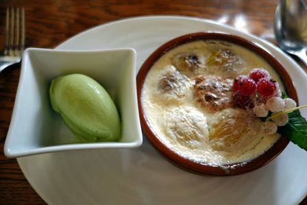 Le menu est écrit sur une ardoise. Je choisis : thon blanc mi- cuit au sésame, purée de haricots blancs / onglet de bœuf grillé, jus de cuisson / flan de reine-claude, glace pistache. Le prix du menu est à peine plus cher que le tiers du prix d’une entrée au Taillevent.