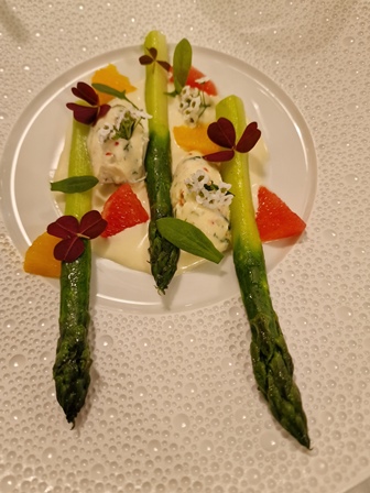 Les asperges sont excellentes, mais les accompagnements de pamplemousse et de fruits acides vont être difficiles pour le vin blanc. Il faut aborder le Puligny-Montrachet Clos de la Mouchère Henri Boillot 1957 sans attendre de lui qu’il ressemble à un Puligny-Montrachet. C’est un vin blanc qui aurait des accents de vin jaune, avec une belle acidité. Il est très agréable et il fait du hors-piste. Il n’est pas dans son appellation mais peu importe. Il a un fruit généreux et large, une belle acidité et on peut vraiment l’aimer et lui trouver du plaisir. Ceci ne peut exister que si on ne juge pas le vin avec des critères d’expert et si on l’accepte tel qu’il est. Je l’ai fait goûter en fin de repas à Gaëtan et à Aurélien le souriant sommelier, qui en sont convenus.
