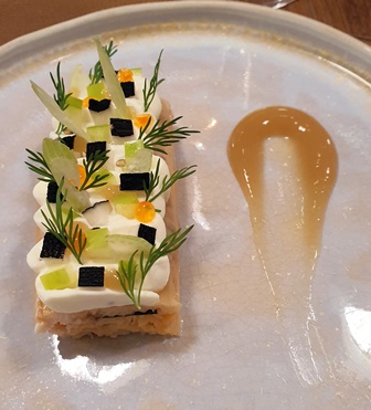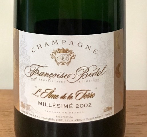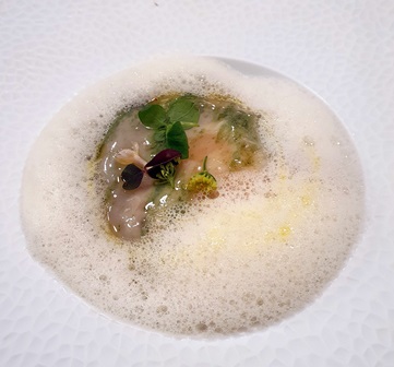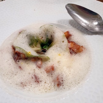 Le premier champagne est un Champagne l’Ame de la Terre Françoise Bedel 2002. Pour un champagne de femme, je le trouve sacrément musclé et incisif. C’est le pinot noir qui lui donne un côté cinglant. J’adore ce champagne sans concession et très gastronomique. Avec l’amuse-bouche où trône une moule sur une délicieuse salade crémée, le champagne fait des merveilles. Il a besoin de mets pour s’exprimer.