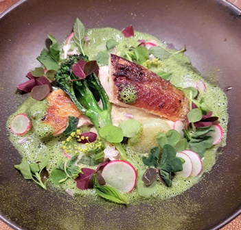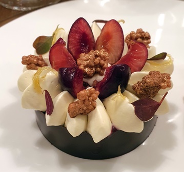 Alain Pégouret est tout souriant et nous allons voir dans sa façon de cuisiner à quel point il est heureux chez lui. Sur ma suggestion nous prenons tous le menu dégustation qui est ainsi rédigé : amuse-bouche / mise en bouche / truite irisée au goût légèrement fumé, crème fouettée au sirop d’érable, marmelade citron, cardamome et condiments / girolles juste saisies, lasagne et jaune d’œuf à peine coulant, relevé par une écume poulette Yuzu et craquelin / volaille Culoiselle rôtie à l’ail noir sous la peau, celtuces et bimis, fleurette d’herbes fortes et thé matcha / cerises gourmandes sur un biscuit moelleux, au pain d’épices, chantilly à la fleur de Sakura, glace au lait d’amande.