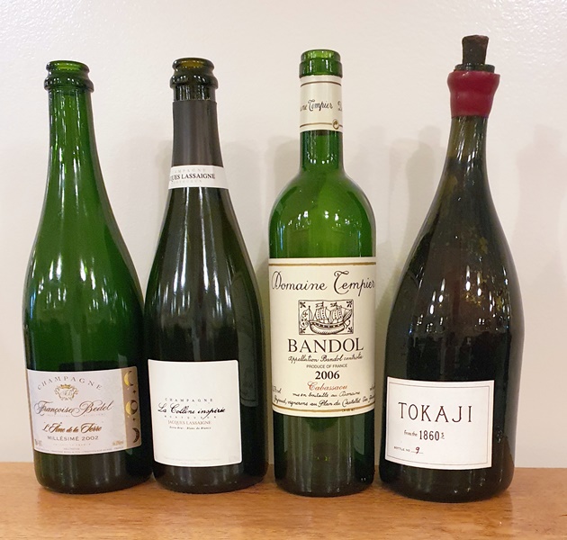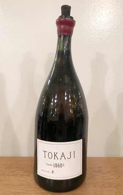 Il y a à notre table un chocolatier célèbre et un des objets du déjeuner est de voir comment nous pourrions faire des événements autour du chocolat et de vins antiques. Aussi ai-je apporté une bouteille entamée depuis des mois, un Tokaji des années 1860 et daté postérieurement avec Christie’s comme étant autour de 1840. Dans les mignardises il y a des palets au chocolat ce qui nous permet de vérifier que le doucereux si complexe de ce Tokaji est un bonheur sur du chocolat.