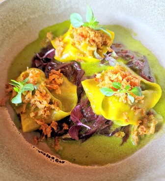 Les plats que j’ai choisis sont : ravioles de coquilles Saint-Jacques et viande de bœuf.