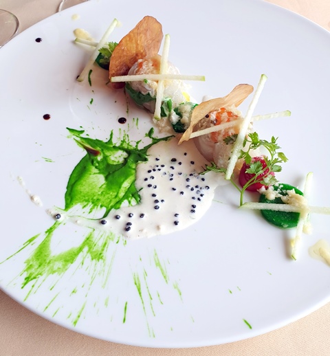 L’amuse-bouche est un essai du chef à base de daurade crue, d’huître et de mille autres saveurs savamment jetées sur l’assiette. Il y a du peintre Matthieu dans sa création dynamique. C’est ce plat que ma femme préférera.