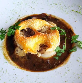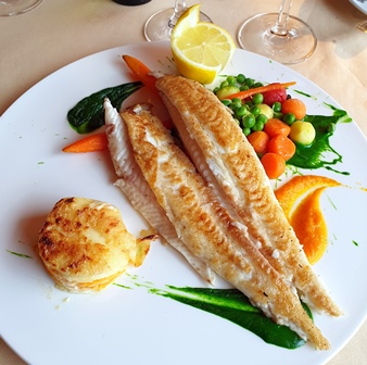 L’entrée est une soupe à l’oignon revisitée, avec de magnifiques coquilles Saint-Jacques. Le plat principal est pour chacun une sole de grande taille préparée de façon classique. Sagement nous n’avons pas pris de dessert car la cuisine du chef est généreuse.