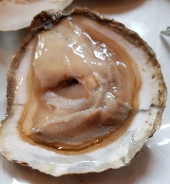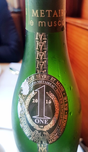 C’est mon ami qui prend tout en charge, le menu comme le début des vins. Nous avons d’abord d’énormes huîtres plates de Belon magnifiquement iodées et goûteuses. Nous buvons un Muscadet Sèvre et Maine sur lie Louis Métaireau Cuvée « One » 2016. Ce vin franc et direct est une mine d’iode. Il est frais, sans chichi et s’adapte parfaitement aux lourdes huîtres.
