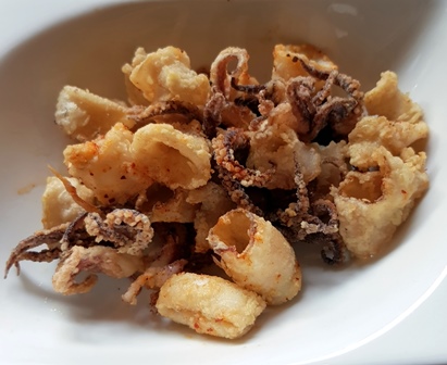 Pour le tartare de daurade, je participe au choix d’un Chablis Grand Cru Moutonne Albert Bichot 2015 qui nous offre un joli fruit et une belle présence. Il arrive froid et il faut le réchauffer entre ses mains. L’ami qui est un habitué demande des croutons aillés qui sont gourmands et ne prennent pas le dessus sur le carpaccio. Les chipirons rôtis qui suivent se marient idéalement au vin bien large en bouche.