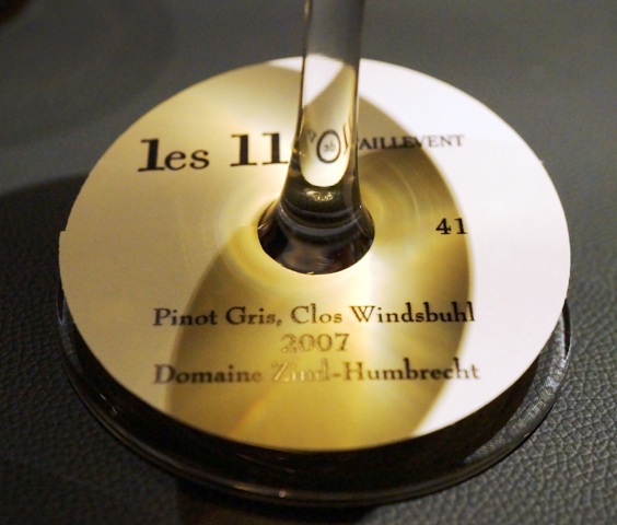 Mon premier vin est un Pinot Gris Clos Windsbuhl domaine Zind-Humbrecht 2007 dont je prends un verre de 7 cl, puisque l’on a le choix entre 7 cl, 14 cl et bouteille. Le vin est précis, original, mais il manque un peu d’ampleur. Il est très adapté à l’excellent risotto. Si la formule du choix au verre est très intéressante, puisque l’on peut avoir accès à des vins dont le budget serait élevé pour 75 cl, cela fait tout drôle d’être seul à boire un vin, que l’on ne peut pas commenter avec ses convives si leurs choix sont différents. L’avantage, c’est que dans un restaurant tourné vers le vin, on peut parler d’autres choses que de vin, ce que nous avons fait. Ce n’est pas désagréable. C’est un paradoxe amusant de cette formule.
