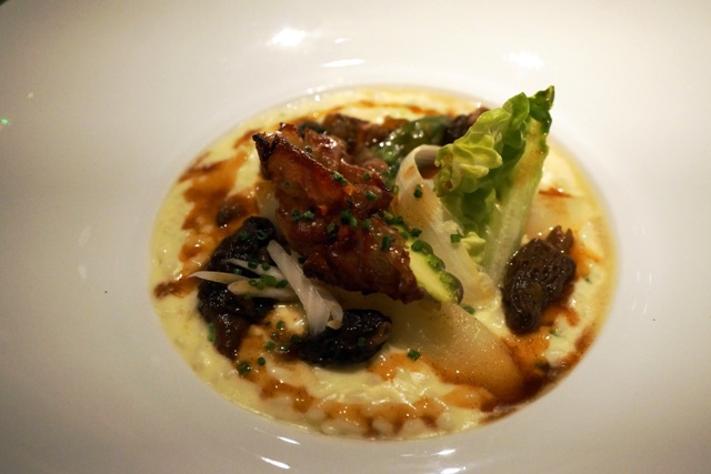 La carte est extrêmement astucieuse puisque les vins sont classés par tranches de prix et sont positionnés dans la même zone de lecture que les plats qu’ils pourraient accompagner. Les choix sont intelligemment facilités. Mes plats seront : le risotto printanier, asperges et morilles / le cabillaud « au naturel », jus de cresson, poireaux au cumin et tartare d’algues.