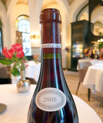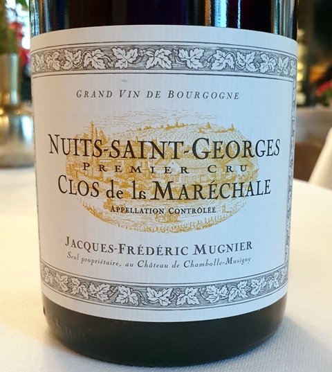 Je choisis dans l’impressionnant livre de cave un Nuits-Saint-Georges Premier Cru Clos de la Maréchale Jacques-Frédéric Mugnier 2008. Le sommelier ouvre le vin loin de notre table ce que je n’aime pas particulièrement. J’aime bien voir ce qui se passe. Il nous sert en nous disant qu’il a un léger goût de bouchon. Il nous laisse juger. Le nez de bouchon est à peine perceptible et en bouche c’est aussi un défaut léger, mais on sent quand même que le vin n’est pas dans l’expression qu’il devrait avoir. Il a une imprécision et un manque de fraîcheur. Nous décidons d’abandonner cette bouteille qui devait être la dernière de 2008 en cave. Nous allions nous tourner vers 2014 mais heureusement, une autre 2008 a été retrouvée en cave.