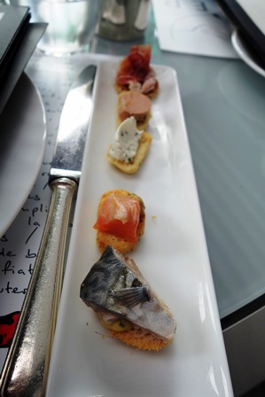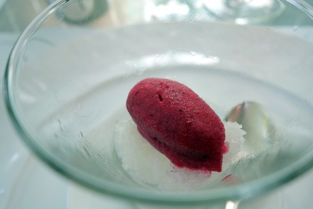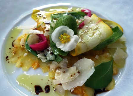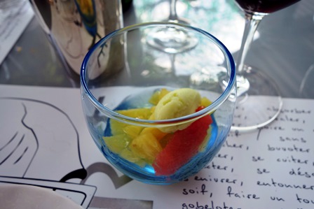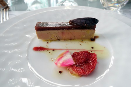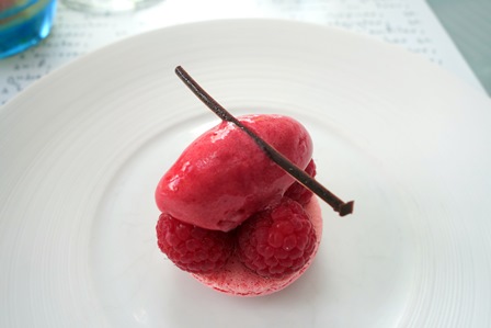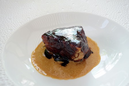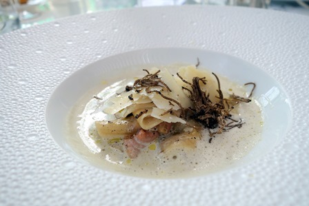 Nous prenons un menu donnant lieu à des choix possibles pour chaque plat. Notre choix est commun : raviole de foie gras et parmesan / turbot braisé au champagne / ris de veau braisé au Porto / plateau de fromages pour moi et feuilleté de poires à la fourme d’Ambert pour notre amie / desserts du chef. Fort agréablement et curieusement, le nombre de surprises du chef qui s’ajoutent à ce menu est quasiment infini. Ainsi nous avons eu une mousseline aux herbes locales, une terrine de foie gras aux figues, une assiette de légumes variés au parmesan et un sorbet que j’imagine être de basilic, et un saint-pierre aux petits légumes aigres-doux et câpre qui se sont succédé avant que n’arrive le premier plat auquel le chef a ajouté une belle brassée de copeaux de truffe d’été. Le lieu est manifestement généreux et cela s’est poursuivi pour le turbot que l’on a agrémenté de grains de caviar largement distribués, précédé d’une dorade et supions non prévus au menu.