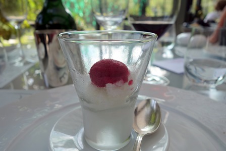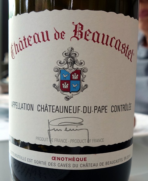 J’ai commandé un Château de Beaucastel Châteauneuf-du-Pape 1998 qui est l’une des bouteilles les plus vieilles de cette carte des vins qui compte une trop forte majorité de vins très récents. La sommelière ouvre la bouteille sur une petite table et prélève un petit verre pour goûter. Elle n’est pas dans mon champ de vision et soudain ma femme me fait signe de regarder. La sommelière carafe le vin sans m’avoir demandé si je le désirais. Il m’a fallu de longues minutes pour que j’oublie cette contrariété. Car dans une atmosphère très chaude dépassant 30° sur la belle terrasse, j’aurais préféré ne pas précipiter l’aération du vin. Malgré ce petit contretemps, ce vin est superbe et d’une année de grande réussite pour Beaucastel. Il a des notes de vins du sud, avec des évocations de garrigue, mais il a aussi des petites traces de café et de caramel bien fondues. Il est vineux, puissant, et d’un grand équilibre. Il s’est très bien trouvé avec le ris de veau malgré le porto sensible. J’en ai prolongé le plaisir avec quelques fromages dont un saint-nectaire.