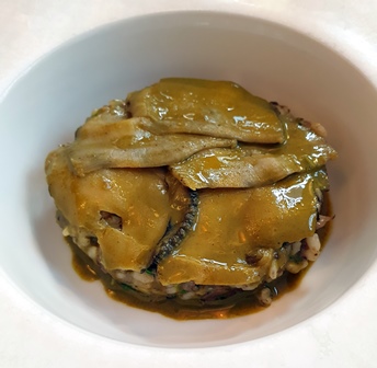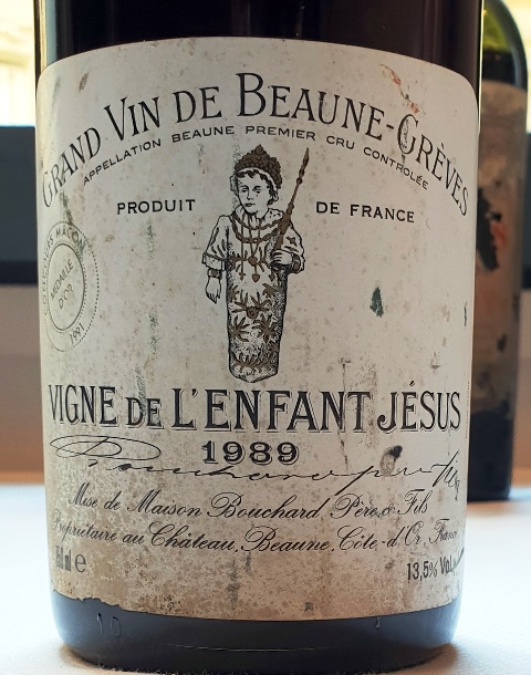 Le plat suivant présente des ormeaux avec un risotto aux champignons. Dès que je le vois, j’ai l’instinct de l’associer au Beaune Grèves Vigne de l’Enfant Jésus Bouchard Père et Fils 1989. Le vin a un léger nez de bouchon qui ne gêne pas le milieu de bouche, sauf à le rendre un peu plus strict, et se ressent surtout dans le finale un peu amer. Et de ce fait, l’accord avec les ormeaux se trouve encore mieux que si le vin avait eu plus de charme. Le vin va progressivement s’élargir et nous offrir un peu plus de pureté et d’émotion. Le plat est délicieux.