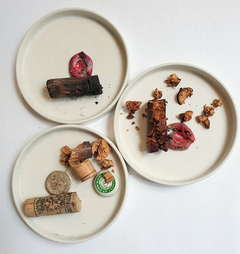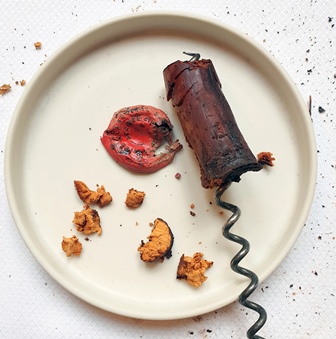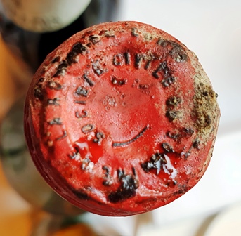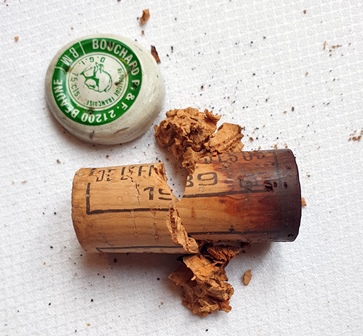Le bouchon du Beaune Grèves s’est fendu en deux en remontant mais je discutais avec Romain et j’ai sans doute manqué d’attention. Le bouchon du Richebourg 1963 est d’un noir gras. Il a tellement tapissé le goulot que la couche épaisse de gras noir m’impose d’utiliser mes doigts pour enlever cette exsudation du vin. Le nez du vin à l’ouverture me fait craindre le pire. Je subodore qu’il me faudra ouvrir une autre bouteille.