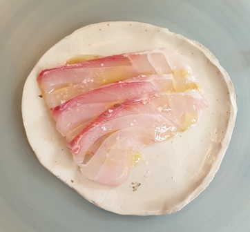 Le menu s’est composé petit à petit sur mes intuitions qui pourraient laisser croire que je voulais « casser les codes », ce qui n’était pas mon intention. Ainsi, comme le parfum du Pétrus 1958 m’était apparu très supérieur à ce que j’attendais, nous allons prendre l’apéritif avec lui, pour éviter un déclin possible, et je commande à Ken, le chef qui travaille aux côtés de Teshi, de préparer des fines tranches de poisson cru. Il y a de la daurade royale, ce qui semble parfait. Le Pétrus 1958