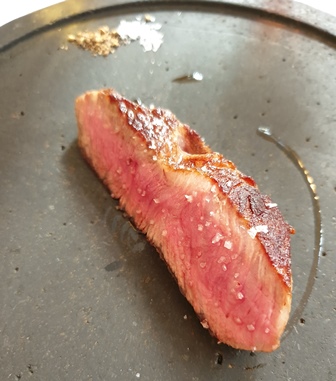 J’ai demandé qu’on nous prépare des petits steaks de wagyu pour accompagner l’Y. Mais quand je vois le plat arriver, je suggère que nous mangions une moitié du steak avec l’Y et une moitié avec le Richebourg. L’accord avec l’Y est parfait car le gras de la viande élargit le côté sauternais du vin de Graves.