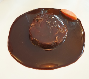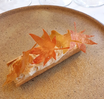 Le cabillaud a une sauce à base de bisque et c’est mon erreur car j’aurais dû demander une sauce viande, car le vin qui accompagne le poisson est le Pétrus. Malgré la sauce l’accord se trouve et le Pétrus 1958 gagne maintenant en velours, ce qui adoucit ses accents truffiers.