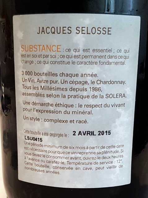 Le Champagne Substance Jacques Selosse dégorgé en avril 2015 est d’une personnalité extrême. Il est conquérant, envahissant, percutant, sans concession, sauf aux plaisirs de la chère, car il est définitivement gastronomique. Il s’en sort bien avec l’œuf qui n’est pas facile pour les vins et il devient sublime sur le caviar et l’huître.
