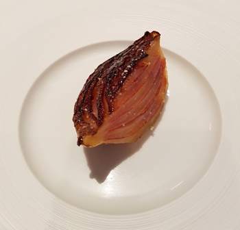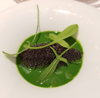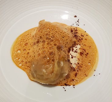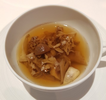 Voici le menu du chef Shinichi Sato que nous avons découvert sans savoir où nous allons : œuf mollet, crème de haddock et betterave / caviar de Sologne, velouté d’épinards fumés, stracciatella et morceaux d’huîtres / consommé de champignons de saison / cabillaud caramélisé et cèpes / ravioles de homard breton et poires, crème de xérès et cacao / oignon des Cévennes et chorizo ibérique / poulet jaune, girolles, sauce vin jaune / tourte au pigeon et foie gras.