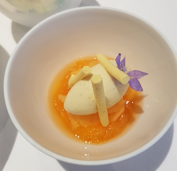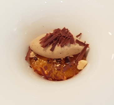 Viennent ensuite quatre desserts : melon glacé, glace vanille / poires, sorbet yaourt et poire, panna cotta pistache / crème brûlée fleur de sureau, sorbet miel / glace café, oranges caramélisées et chocolat.