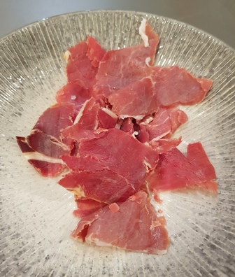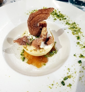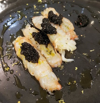 Voici le menu que Valérie Costa a composé pour nous trois : jambon de cochon noir de Bigorre de 28 mois de la famille Grau / craquants aux olives noires / gressins au beurre / langoustines tiédies à l’huile d’olive à la mandarine et caviar osciètre Kaviari / filet de veau aux morilles et lard paysan, courge spaghetti à la vapeur / saint-nectaire fermier / la mangue et la passion, biscuit caramélisé, pistaches et coulis chaud de mangue / sablé citron et sablé aux pépites de chocolat.