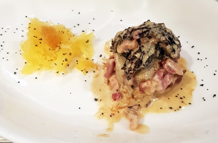 Pour le veau Jean-Marc me fait plusieurs propositions et nous continuons au champagne avec le Champagne Bollinger Grande Année 2005. Il se montre très pertinent sur le filet de veau, sur la morille mais surtout pour moi avec la courge très finement découpée et donc aérienne, qui crée un accord couleur sur couleur. Le Bollinger ne joue pas sur le même registre gastronomique que le Salon. Il est plus carré, solide et droit, sans atteindre la complexité charmeuse du Salon. Il aurait fallu inverser l’ordre des champagnes mais pour le menu cet ordre est le plus pertinent. Le Bollinger est excellent avec le saint-nectaire d’un affinage idéal.