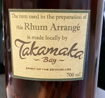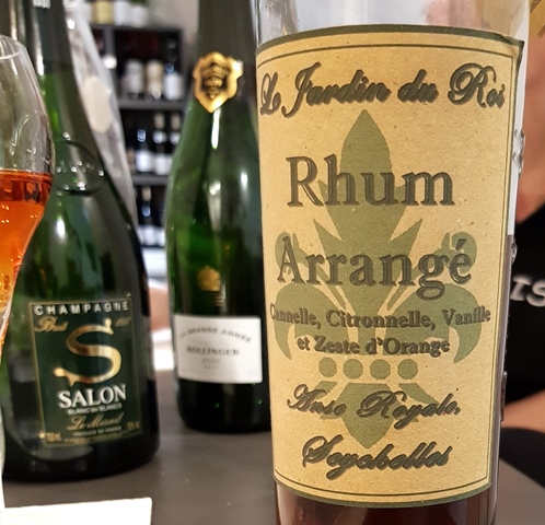 Le dessert se prend avec un Rhum arrangé des Seychelles Le Jardin du Roi, au rhum Takamaka fait avec cannelle, citronnelle, vanille et zeste d’orange. C’est tellement bon qu’on en reprend en oubliant la charge alcoolique masquée par le charme de cette liqueur. L’accord avec la mangue est gourmand.