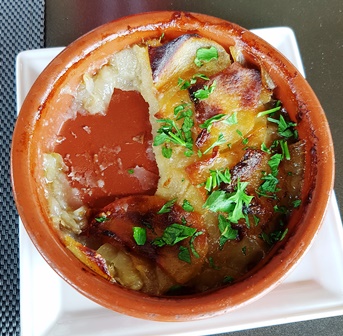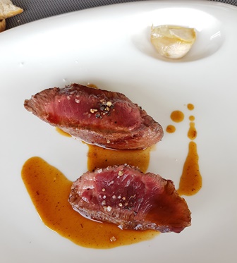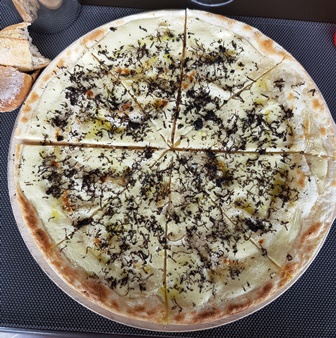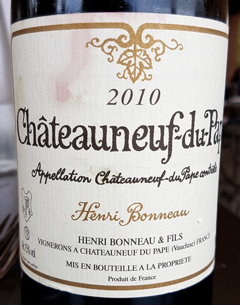 Nous sommes huit à table avec des menus tous différents. Le mien sera fine pizza aux copeaux de truffe noire puis Presa de cochon ibérique avec un gratin de pommes de terre. La pizza est délicieuse et outrageusement copieuse. La viande de porc est extrêmement goûteuse et bien malin celui qui reconnaîtrait qu’il s’agit de porc. Le Châteauneuf-du-Pape Henri Bonneau & Fils 2010 est de couleur presque noire. Il titre 15°. Le nez est envoûtant de cassis écrasé. En bouche c’est sa fraîcheur qui signe un grand vin. On se régale avec ce vin généreux, facile et opulent sans être imposant. Il est « nature », direct, sans chichi. Et on l’aime.