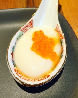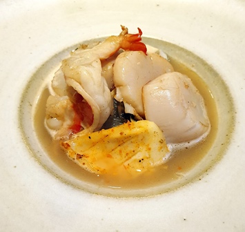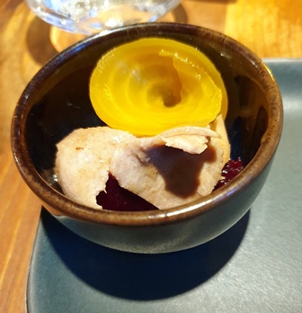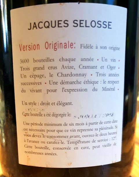Ce menu sera accompagné de thés différents à chaque plat, servis par Chiwah, et j’ai choisi un Champagne V.O. Jacques Selosse dégorgé en juillet 2016 qui a donc un peu plus de trois ans de dégorgement, ce qui est idéal. Le champagne a une couleur qui commence à se dorer, la bulle est active et fine, le nez est intense et en bouche ce champagne est ingambe, entraînant et hautement gastronomique.