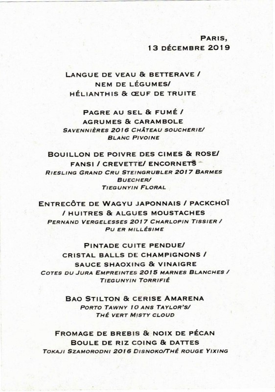 Le menu unique, donné seulement en fin de repas, est ainsi composé : langue de veau et betterave / nem de légumes / héliantis et œuf de truite // pagre au sel et fumé, agrumes et carambole / bouillon de poivre des cimes et rose, fansi, crevette et encornets / entrecôte de wagyu japonais, packchoï, huîtres et algues moustaches / pintade cuite pendue, cristal balls de champignons, sauce shaoxing et vinaigre / bao stilton et cerise amarena / fromage de brebis et noix de pécan, boule de riz, coing et dattes.