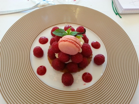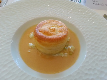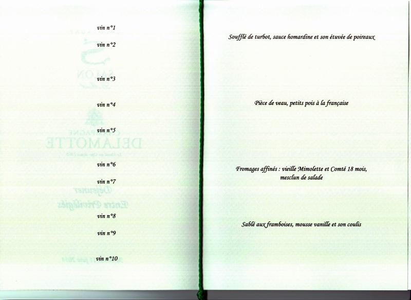 Nous montons à l’étage pour rejoindre la très jolie salle à manger aux tons d’or et de sable. Le menu qui est mis à chaque place indique sur la page de gauche : vin n° 1, vin n° 2, … jusqu’à vin n° 10. Sur la page de droite il y a le menu : soufflé de turbot, sauce homardine et son étuvée de poireaux / pièce de veau, petits pois à la française / fromages affinés : vieille mimolette et comté 18 mois, mesclun de salade / sablé aux framboises, mousse vanille et son coulis.