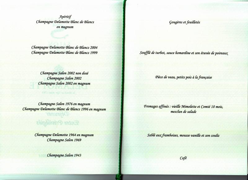 Mon classement de ces vins est 1 – Salon 1943, 2 – Salon 1969, 3 – Delamotte 1996. Le plus émouvant est pour moi le Salon 1943 qui montre à quel point l’âge réussit à Salon. La cuisine a été pertinente et bien exécutée. Les convives de tous horizons sont éminemment sympathiques. Ce fut un plaisir mais aussi un honneur de participer à un tel événement.