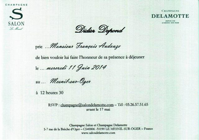 Didier Depond, président de la maison de champagne Salon-Delamotte lance une invitation à déjeuner au siège de Salon. Ça ne se refuse pas. Nous sommes dix-huit et je reconnais des fidèles amis de Didier, de tous horizons, avocats, sommelier, marchand de fleurs, journaliste, financier, directeur d’une école de dégustation, caviste et bien d’autres. Ils viennent de plusieurs pays, Argentine, Grande-Bretagne, Suisse. Certains sont des professionnels du vin et d’autres non, mais tous sont des amis de Didier.