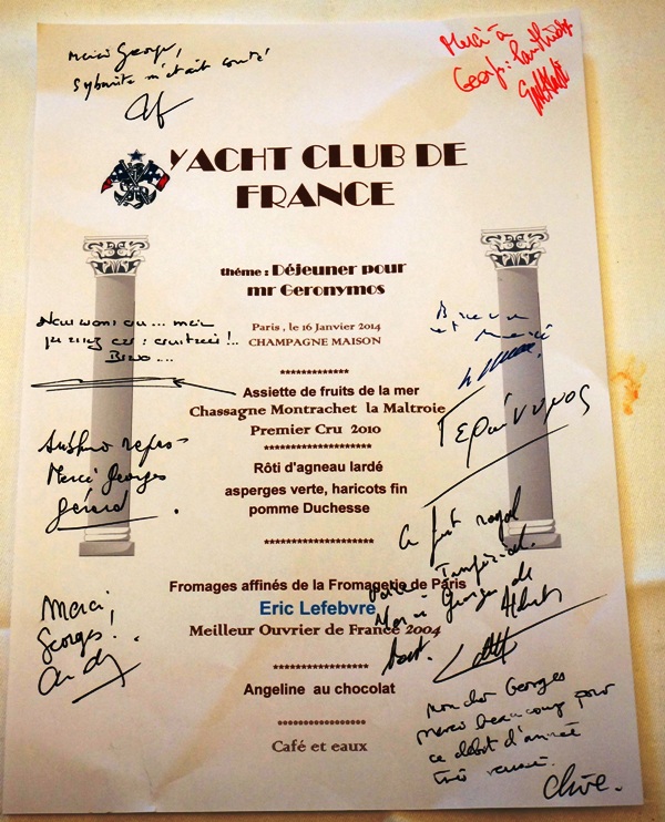 Notre groupe de conscrits se retrouve au Yacht Club de France. L’apéritif est composé de poutargue, de poulpe, d’encornets et d’olives vertes que nous grignotons avec un Champagne Moët & Chandon Brut Impérial sans année qui est extrêmement plaisant, chaleureux, aux jolis fruits dorés.