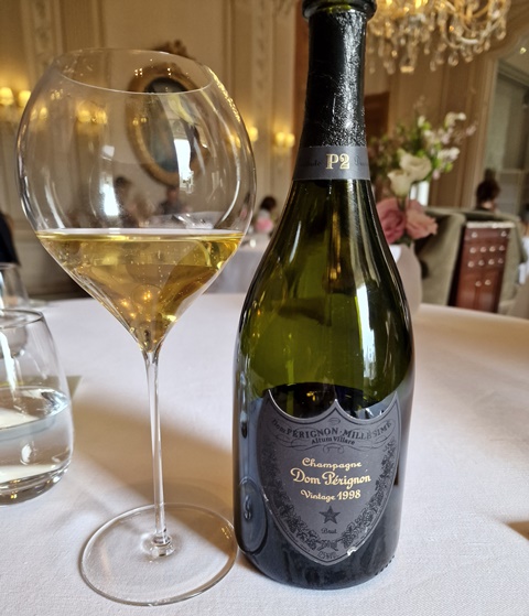 La carte des vins est faite de deux livres, l’un pour les champagnes et l’autre pour les vins. En les voyant, ma femme me dit qu’elle aurait le temps d’aller prendre le thé. J’essaie d’aller au plus vite mais la carte des champagnes est particulièrement fournie et alléchante. Je choisis un champagne déjà ancien grâce aux indications de Martin, mais on vient de nous apporter la carte des menus et je repère un menu au caviar. Je vais changer : qui dit caviar dit Dom Pérignon aussi mon choix sera Champagne Dom Pérignon P2 1998.