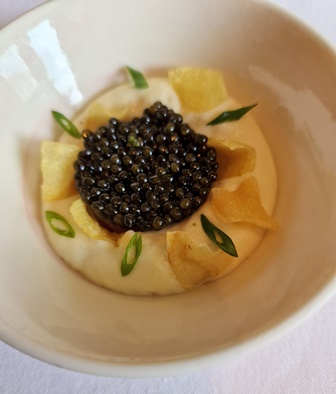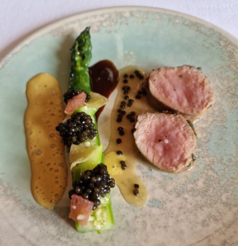 Tout dans ce menu est réussi. L’accord du caviar avec le poireau est une vraie gourmandise. Le caviar avec le carré de veau est d’une cohérence absolue et d’une belle pertinence. Et la plus belle réussite est celle de l’asperge verte avec le caviar, un mariage superbe.