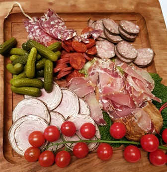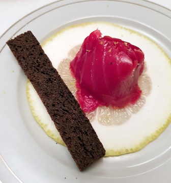 Depuis quelques mois, l’apéritif est à lui seul un vrai repas. Nous avons commencé par une petite coupelle de ris de veau et écrevisse, puis une assiette copieuse de cochonnailles, avec de l’andouille, du chorizo, de la viande fumée et divers saucissons. Ensuite, de belle huîtres normandes, un saumon fumé trempé de betterave sur un cédrat et une coquille Saint-Jacques chaude sur une purée qui mérite tous les compliments. Après cela, qui aurait encore faim ? Pour faire passer tout cela, nous avons bu un Champagne Deutz Brut Classic sans année et un Champagne Taittinger Brut sans année qui sont faciles à boire mais ne brillent pas particulièrement par leurs complexités, essentiellement parce que j’ai en mémoire le Substance de Selosse bu la veille.