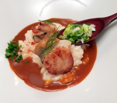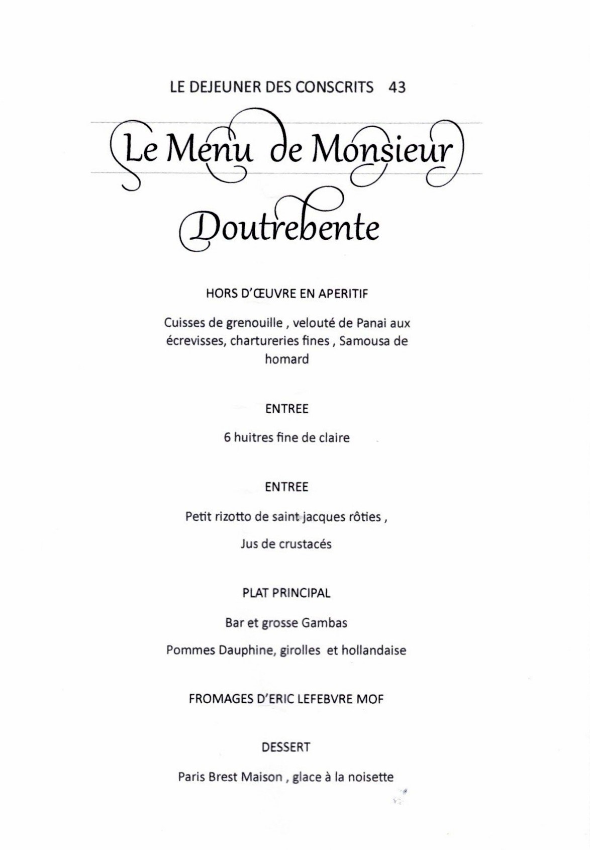 Le menu conçu par le chef avec Thierry Le Luc, pour les vins de notre ami, est : huîtres fines de claires / petit risotto de Saint-Jacques rôties, jus de crustacés / Bar et grosses gambas, pomme Dauphine, girolles et hollandaise / fromages d’Eric Lefebvre MOF / Paris-Brest maison, glace à la noisette.