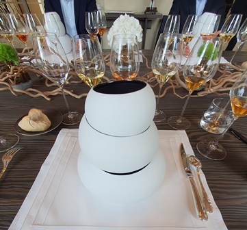 En attendant Vincent Chaperon, je rencontre Pierre-Louis Araud, responsable des relations avec la clientèle privée, qui sera le troisième convive de notre table. Il me propose un verre de Champagne Dom Pérignon Vintage 2008 que je trouve beaucoup plus vif que ceux que j’ai eu l’occasion de boire jusqu’ici. Est-ce dû à une température idéale ou à une évolution qui épanouit le 2008, je ne sais pas. Toujours est-il que je le trouve particulièrement brillant, large et ensoleillé.