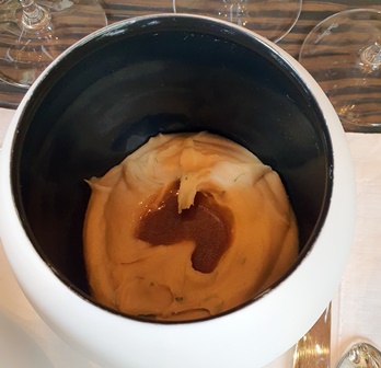 Le risotto à la Buratta est associé au Champagne Dom Pérignon Rosé Vintage 2006. Une première bouteille a un petit défaut. Elle est vite remplacée par une autre qui montre un rosé généreux, agréable mais qui, à mon goût, manque un peu d’âge. Dom Pérignon rosé mérite d’avoir plus de vingt ans. La mâche croquante du risotto gêne un peu l’accord, même si le plat est délicieux.