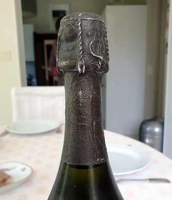 Le Champagne Dom Pérignon 1990 a un bouchon qui résiste et nécessite que je l’extirpe avec un casse-noix en tournant le plus possible puisque le bouchon ne veut pas remonter. Il vient entier. Le pschitt est affirmé. La couleur est d’un or très clair. Le nez est intense. Tout en lui évoque l’or. En le buvant, c’est comme si l’on avait posé sur ma langue une boule d’or. Mais enfant trouvent le champagne très doux. Je le trouve très riche et serein. Il est au-dessus de la mémoire que j’ai de ce beau millésime de Dom Pérignon. Il est si abouti que je le trouve dans une expression parfaite et il ne serait besoin d’aller chercher des P2 et P3, d’autres plénitudes de ce champagne, tant son expression aujourd’hui est l’aboutissement de ce qu’on pourrait souhaiter boire. C’est avec la rillette que l’accord est le plus simple et le plus pertinent.