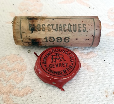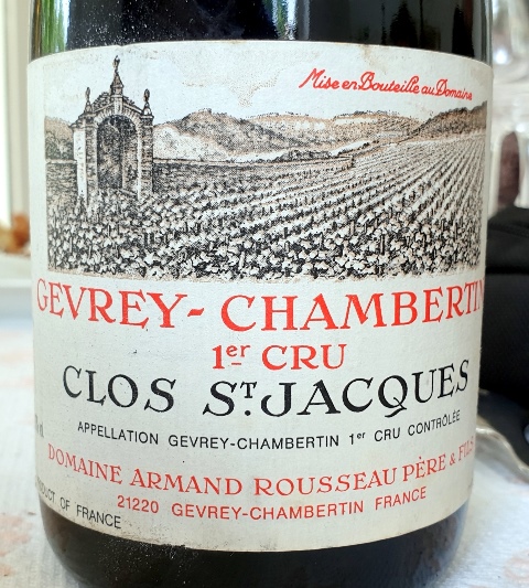 La bouteille est assez vite finie car ma fille cadette est de la partie et je propose d’ouvrir un autre champagne mais mes enfants ont envie de vin rouge. Il faut qu’il soit jeune car il sera ouvert sur l’instant. J’ouvre un Gevrey-Chambertin Clos Saint-Jacques Domaine Armand Rousseau 1996. Sa couleur est plutôt ambrée pour un vin jeune. Le vin est superbement délicat et bourguignon. Il est subtil, et sur un chèvre Sainte-maure-de-Touraine il crée un accord parfait. Ce vin progressera sans doute avec quelques décennies de plus, gagnant en plénitude, mais tel qu’il est, c’est un bourgogne racé et vif très gastronomique. En le buvant, on a l’impression de croquer de beaux grains de raisins. Dans ce millésime, il aura un grand futur.