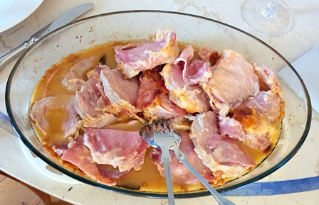 Le plat principal est une pièce de veau qui est entaillée de tranches de lard et de parmesan. De petites pommes de terre en robe des champs complètent le plat. Le Chambolle-Musigny Coron Père & Fils 1967 a une couleur très foncée, un niveau parfait et un parfum intense et envoûtant. Il est riche large et gourmand. C’est un Bourgogne accompli qui n’a pas d’âge tant il est à maturité idéale.