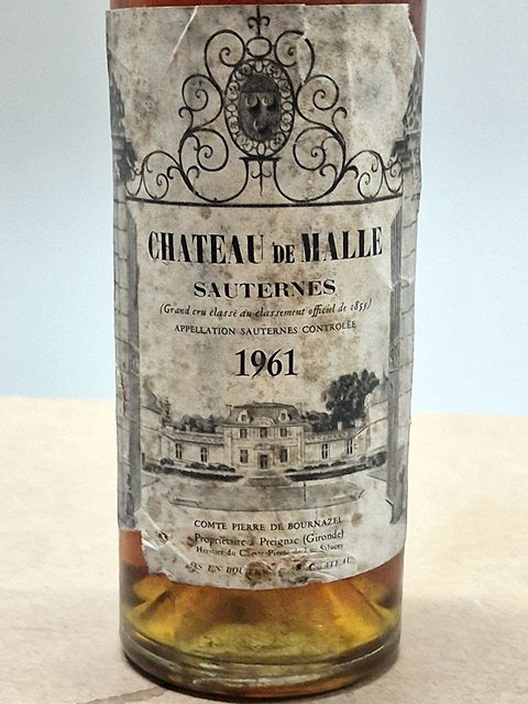 Pour le fromage nous avons un Champagne Laurent Perrier sans année un peu monolithique mais qui joue son rôle. Pour le dessert, j’avais ouvert un Château de Malle Sauternes 1961 beaucoup plus riche que le Bordeaux Vieux et de belle prestance, un sauternes abouti, équilibré et plein de charme.