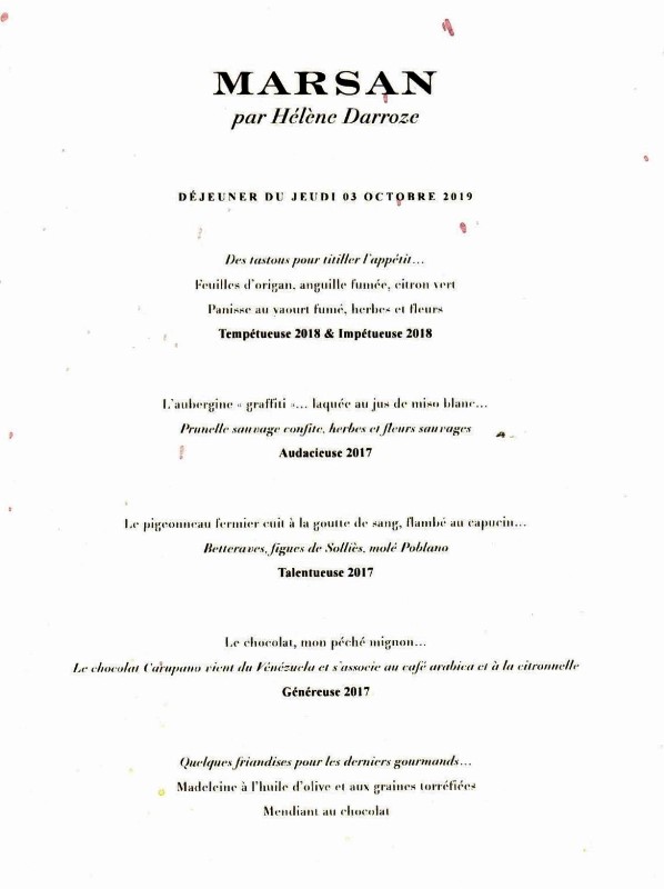 Ayant envie d’explorer la cuisine d’Hélène Darroze en vue d’un de mes dîners, je réserve une table pour moi seul, afin que je puisse étudier quelques plats et travailler ensuite avec le chef et le sommelier au menu qui accompagnerait les vins que j’ai prévu d’ouvrir. Au moment où je sors du taxi pour entrer dans le restaurant Marsan, je vois un journaliste ami, qui a participé à plusieurs de mes dîners, qui s’apprête à faire de même. Il va assister à un déjeuner de presse consacré à un domaine viticole, et je lui dis que je déjeunerai seul. Il me propose de demander que je puisse participer à ce déjeuner.