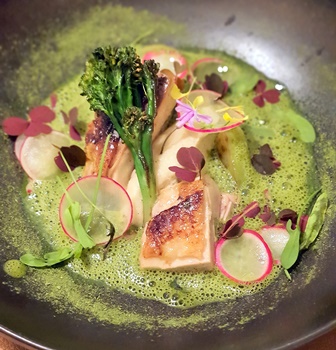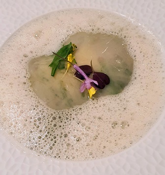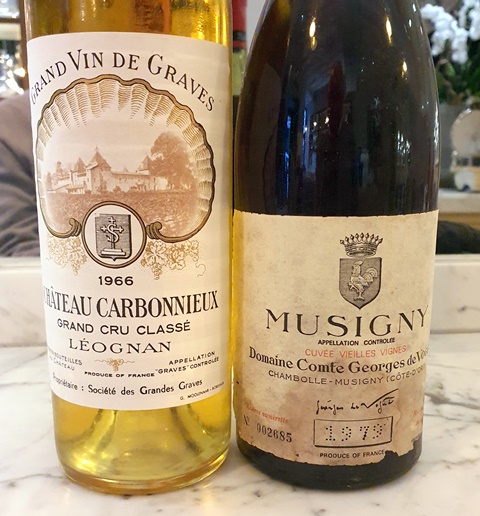 Le Champagne Krug Clos du Mesnil 1998 de Pablo est impressionnant de complexité. Il virevolte dans des saveurs changeantes et kaléidoscopiques. Je suis impressionné par l’immense variété de ses saveurs, surtout sensible à l’attaque en bouche. Il convient bien aux amuse-bouches. Je suggère que nous buvions en même temps le Château Carbonnieux blanc 1966 que j’ai apporté, à la couleur très claire. Il est dans un état d’absolue perfection et sans âge. On dirait 1990, on aurait raison. Je suis content de montrer à mes convives à quel point le champagne et le vin blanc se fécondent. Chacun rend l’autre plus expressif, lorsqu’une gorgée de l’un est suivie par une gorgée de l’autre.