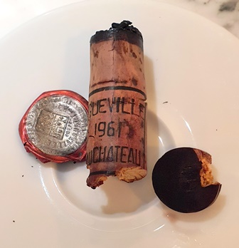 La volaille d’une douceur fondante est maintenant mariée au Château Pichon Longueville Baron 1961 d’Alain, qui comme le Carbonnieux, est dans un état de totale perfection. Contrairement au blanc, il fait son âge, mais il a le même état de perfection, au-dessus de mon attente. L’accord est superbe et marche aussi avec le vin italien.